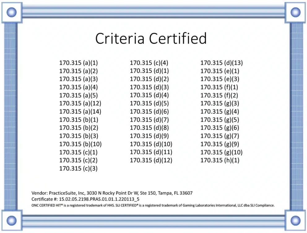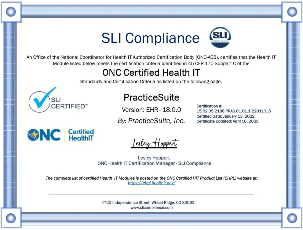 PracticeSuite EHR was awarded Ambulatory ONC Certified on January 13, 2022.